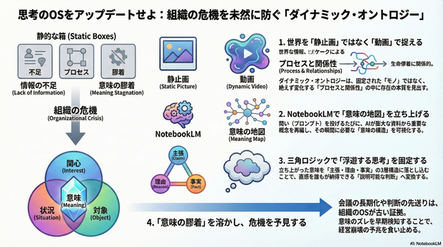 NotebookLMの優れた点は、社内に散らばる情報から**「判断のズレ」や「違和感」という危機の兆候を早期に検知し、手遅れになる前に意思決定の軌道修正を行う**仕組みを作ることです。