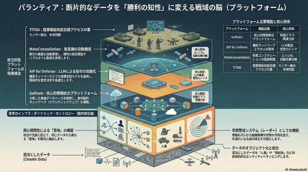 パランティアの圧倒的な精度の源泉は、単なるデータ解析ではなく「ダイナミック・オントロジー」という哲学的な思考インフラにあります。 「Gotham 5」や「AIP」といったプラットフォームは、衛星画像、通信、SNSなどのカオスなデータを、「人員」「場所」「発射台」といった具体的オブジェクトに変換し、戦場のリアルタイムな「デジタルツイン」を構築しました。